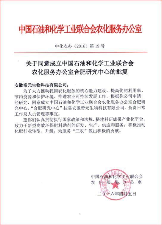 为大力推动我国农化服务的核心能力建设、提高化肥利用率、节约资源和保护环境、推进农业可持续发展。2016年4月5日,中国石油和化学工业联合会农化服务办公室合肥研究中心正式成立,由安徽帝元生物科技有限公司运营。“合肥研究中心”将认真贯彻执行国家政策和法规,搭建科研成果产业化平台,致力于新型高效环保肥料助剂的研发、生产、供应和服务,积极推动化肥行业转型、升级,为服务“三农”做出积极的贡献。