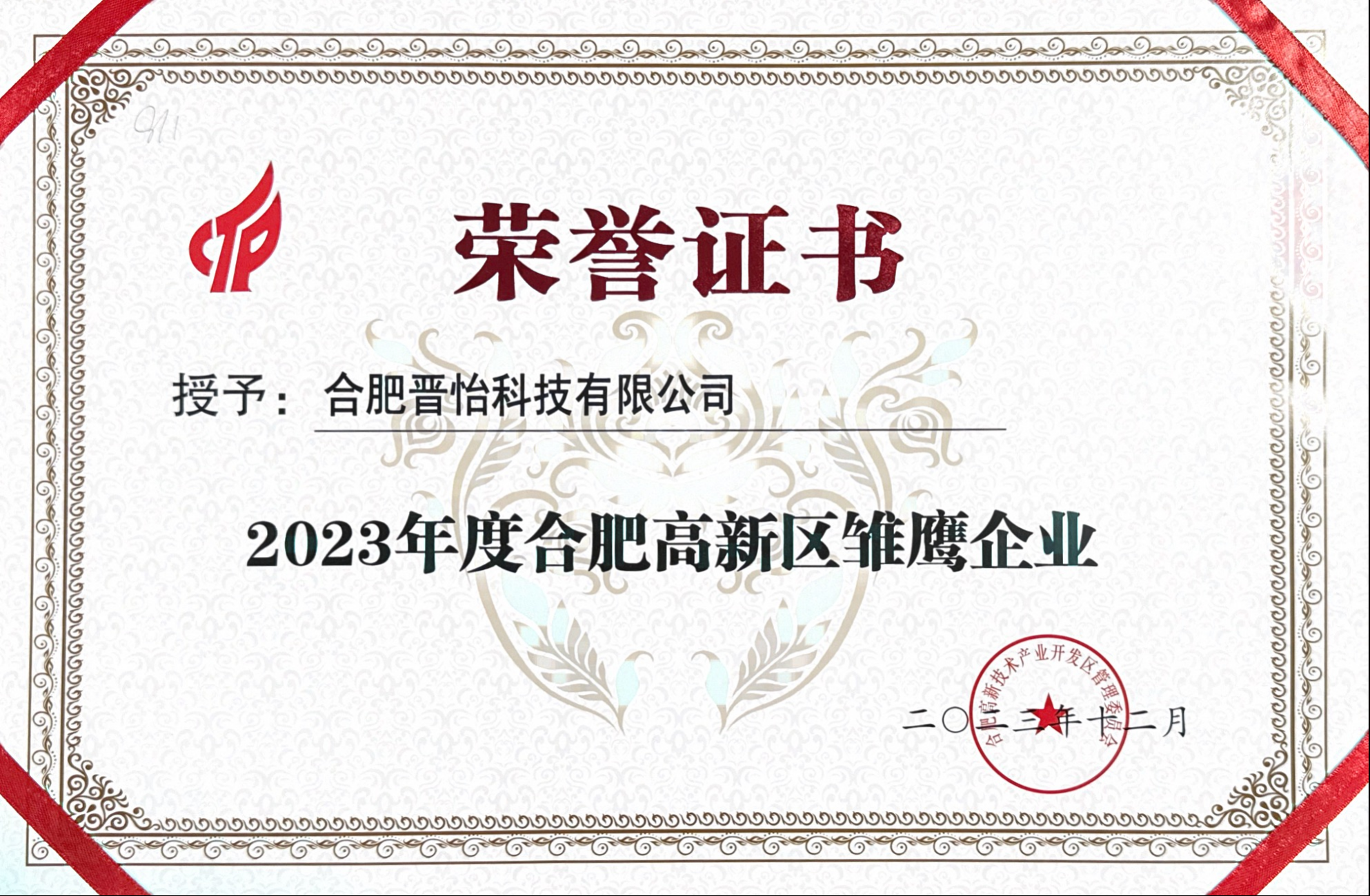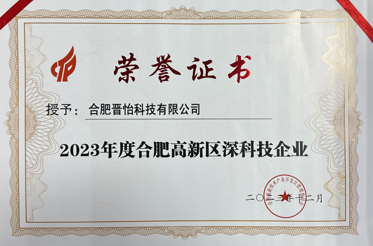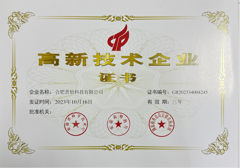 晋怡科技成立仅仅两年时间,就成功认定为国家高新技术企业、通过ISO9001质量体系认证,合肥市重点产业企业,合肥高新区深科技企业、雏鹰企业。