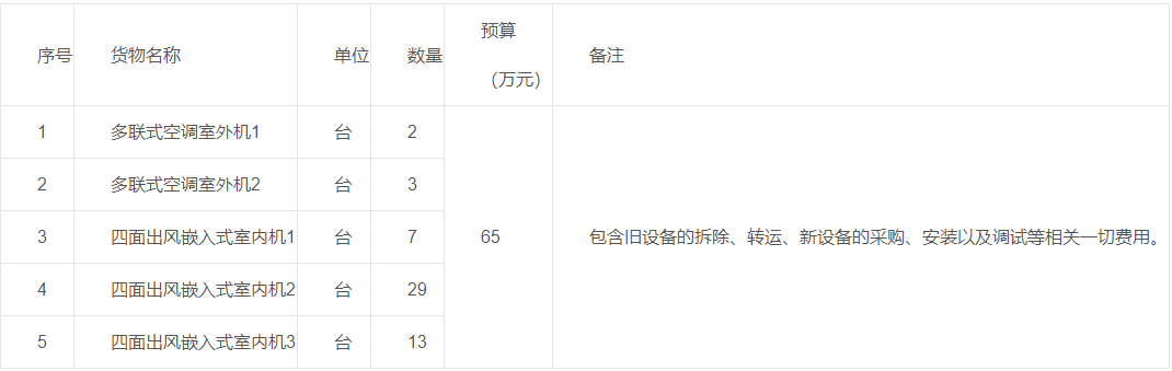 原中央空调系统拆除并转运至招标人指定位置;新中央空调系统的采购、安装、调试、检测、综合验收、培训、质保期服务;空调配套电气安装工程;原装饰顶面拆除及恢复工程。