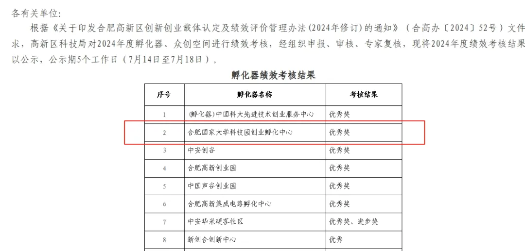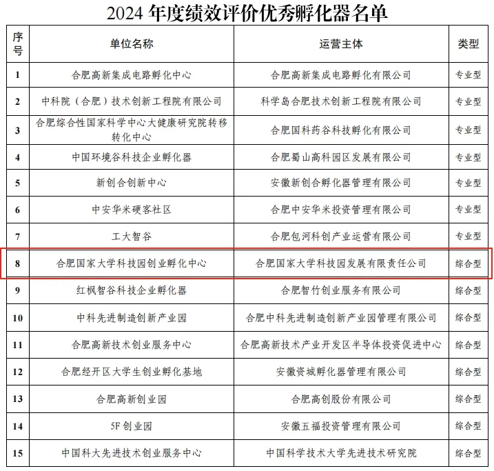 近日,304永利集团创业孵化中心在合肥市及高新区2024年度科技企业孵化器绩效考核中均获评“优秀”等次,在合肥市综合型孵化器绩效评价中位列首位。