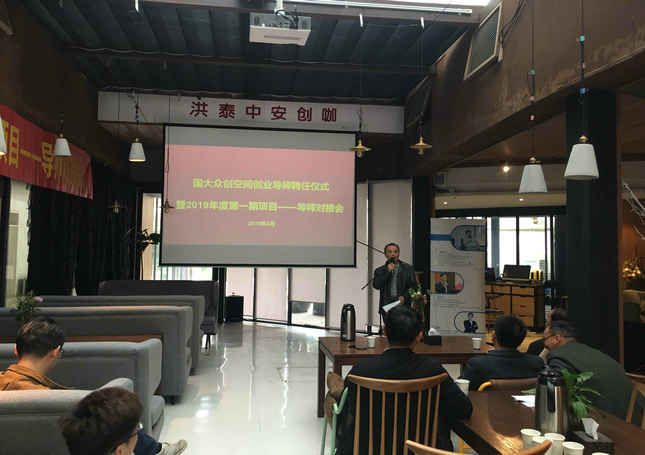 在聘任仪式开始之前,国大众创空间常务副总经理杜明先生给大家详细介绍了合肥国大众创空间的发展建设情况,然后从横向的角度为大家介绍了国大众创空间的定位、特色及理念,团队情况,服务模式及内容,以及取得的服务成效。2018年11月,国大众创空间获得合肥市众创空间认定,同年12月获得安徽省众创空间的认定。