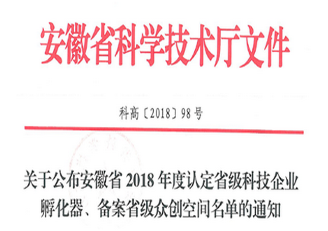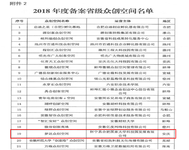 根据《安徽省众创空间备案实施细则》(科高〔2016〕14号)相关规定,经运营主体申报、各市科技局审核推荐、专家评审等程序,2018年12月28日省科技厅正式发文,梦达众创空间成功备案为省级众创空间,实现安庆市怀宁县省级众创空间零的突破!