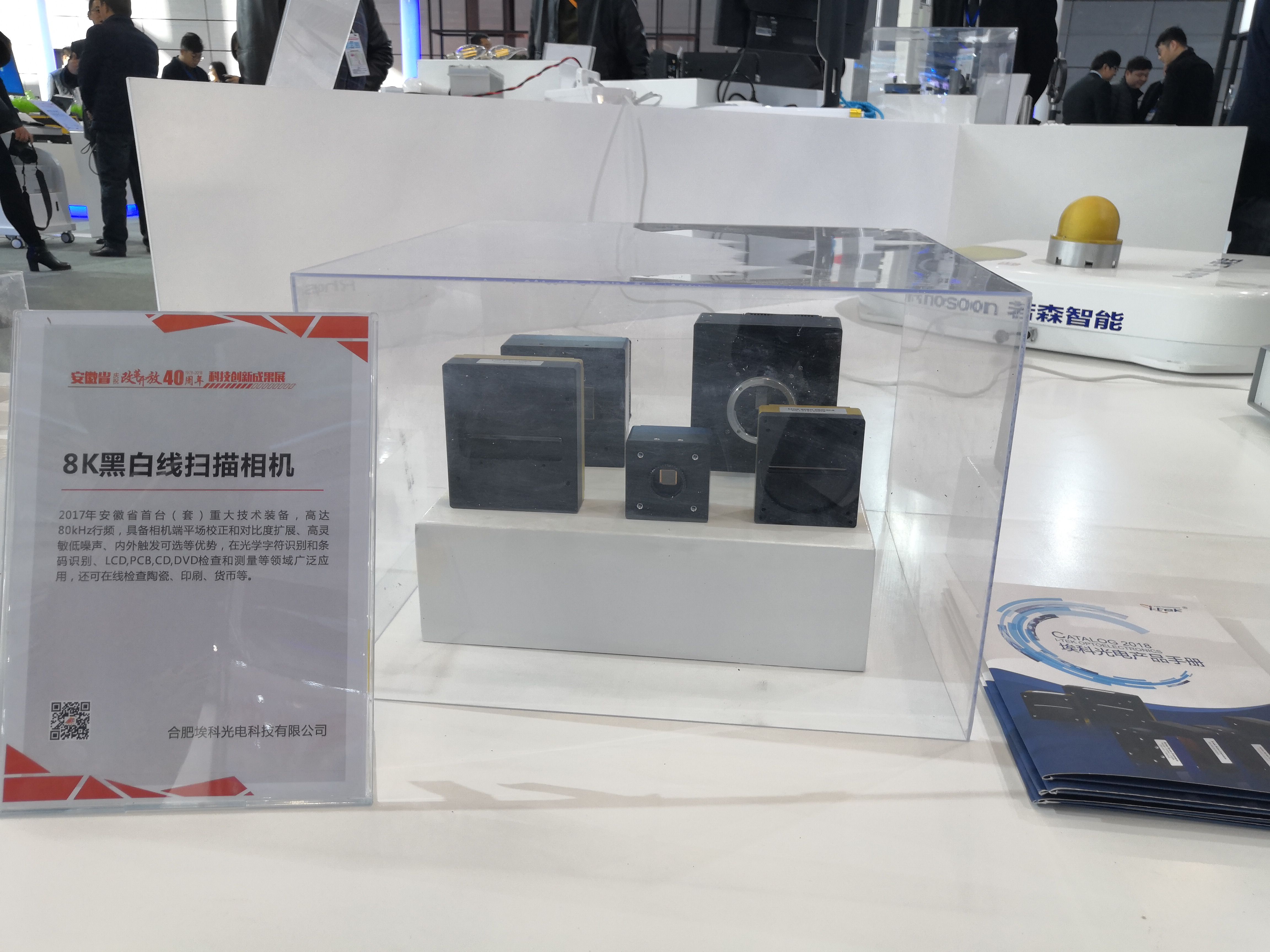 其中,合肥埃科光电科技有限公司展出的8K黑白线扫描相机于2017年12月获得了安徽省首台(套)重大技术装备认定,高达80kHz行频,使其具备相机端平场校正和对比度扩展、高灵敏低噪声、内外触发可选等优势,可在光学字符识别和条码识别、LCD,PCB,CD,DVD检查和测量等领域广泛应用,还可用于在线检测陶瓷、印刷、货币等。