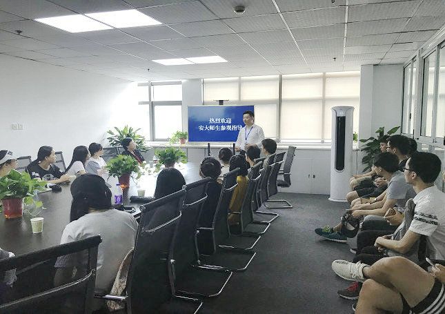 随后一行人来到安徽智迈科技股份有限公司,学生们参观了公司的办公环境,舒适的休闲区和别具一格的会议室,轻松的办公环境以及智迈的新零售服务商运营理念,引起了学生们浓厚的兴趣。活动中,培训总监姚万里以自身从事电商多年的经历,向现场的师生分享他们的小程序以及他们对今后市场的前景与展望。