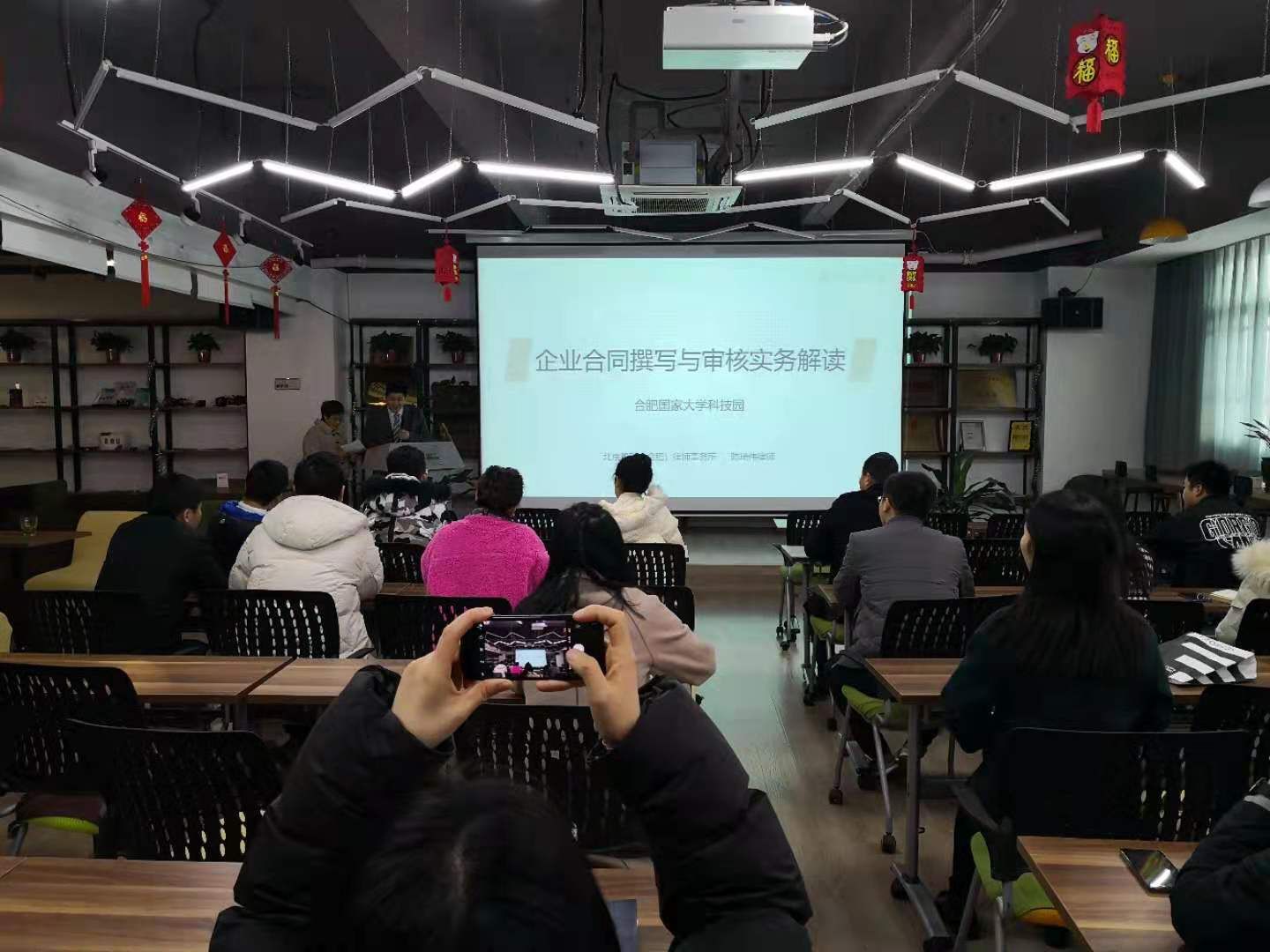 2019年11月28日下午,304永利集团特邀北京盈科(合肥)律师事务所陈琦伟律师来为园区企业作企业合同撰写与审核法律风险防范培训。