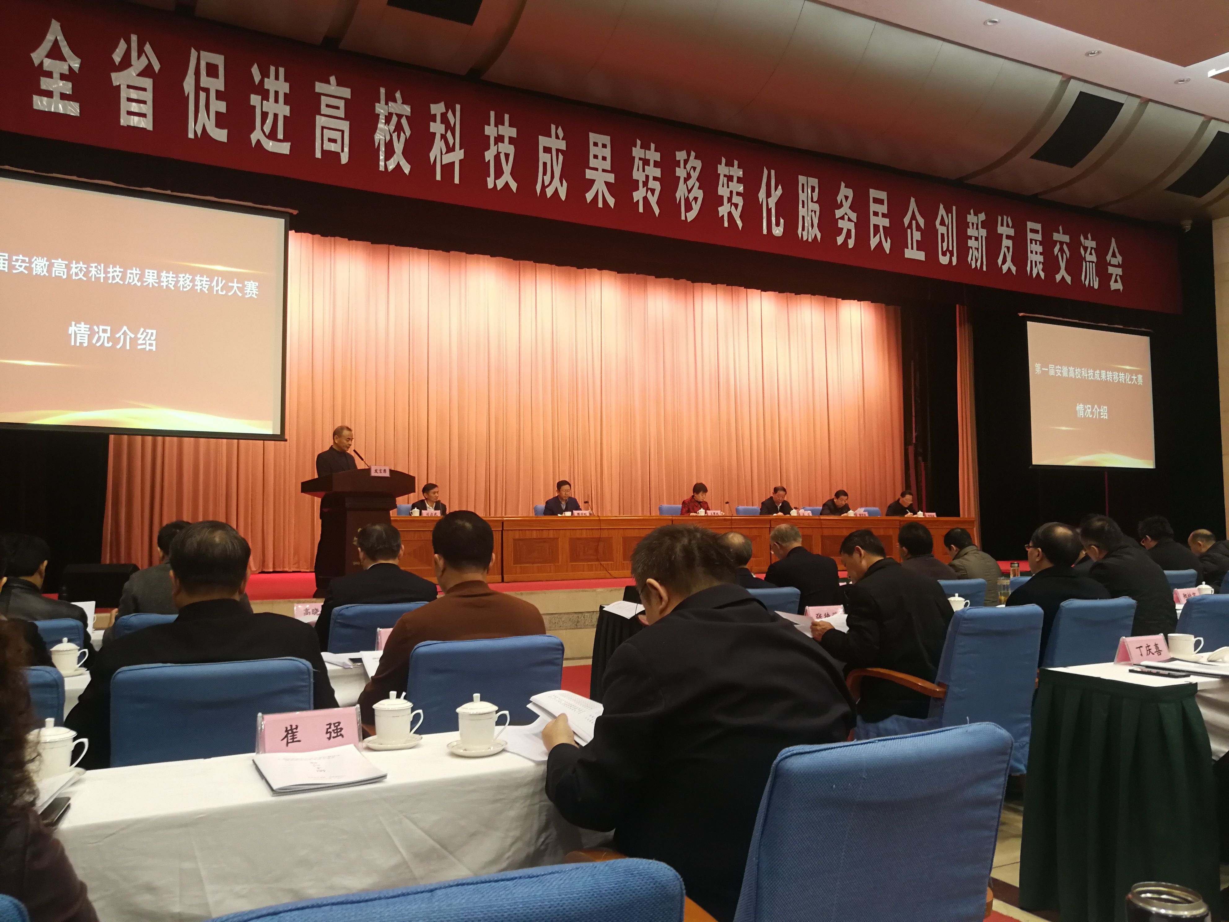 在欢快的乐曲声中,出席会议的领导为获奖的高校项目团队和转化企业代表颁奖,安徽大学副校长俞本立、安徽中环环保科技股份有限公司董事长张伯中、安徽理工大学副校长郑明东、安徽瀚鼎智能技术有限公司董事长吴庆分别发言。
