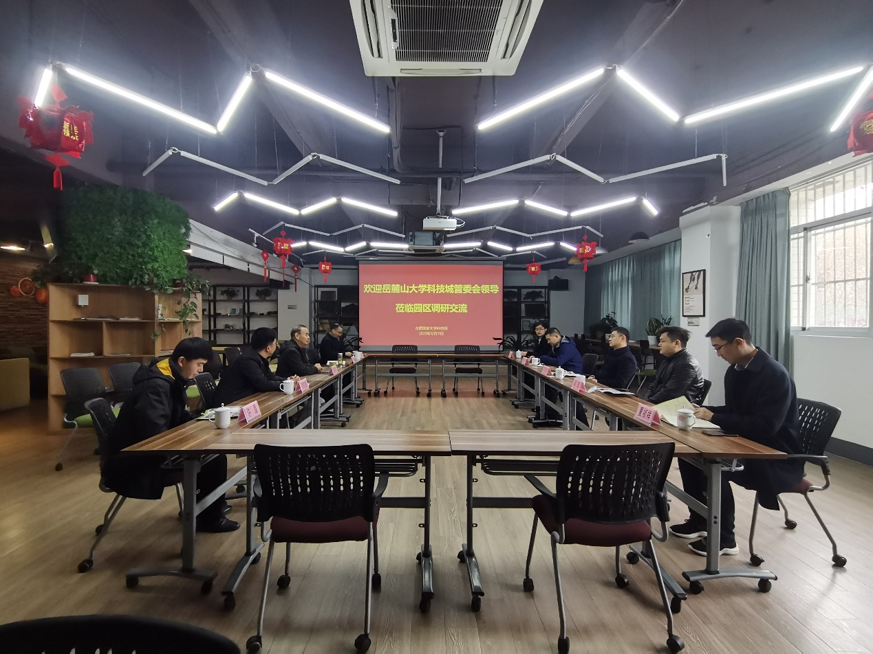 2020年12月11日上午,岳麓山大学科技城管理委员会主任罗予武、副主任曹成文一行来大学园进行调研交流,304永利集团总经理王荣钊、财务总监孟庆川、副总经理毛庆等热情接待了来宾。