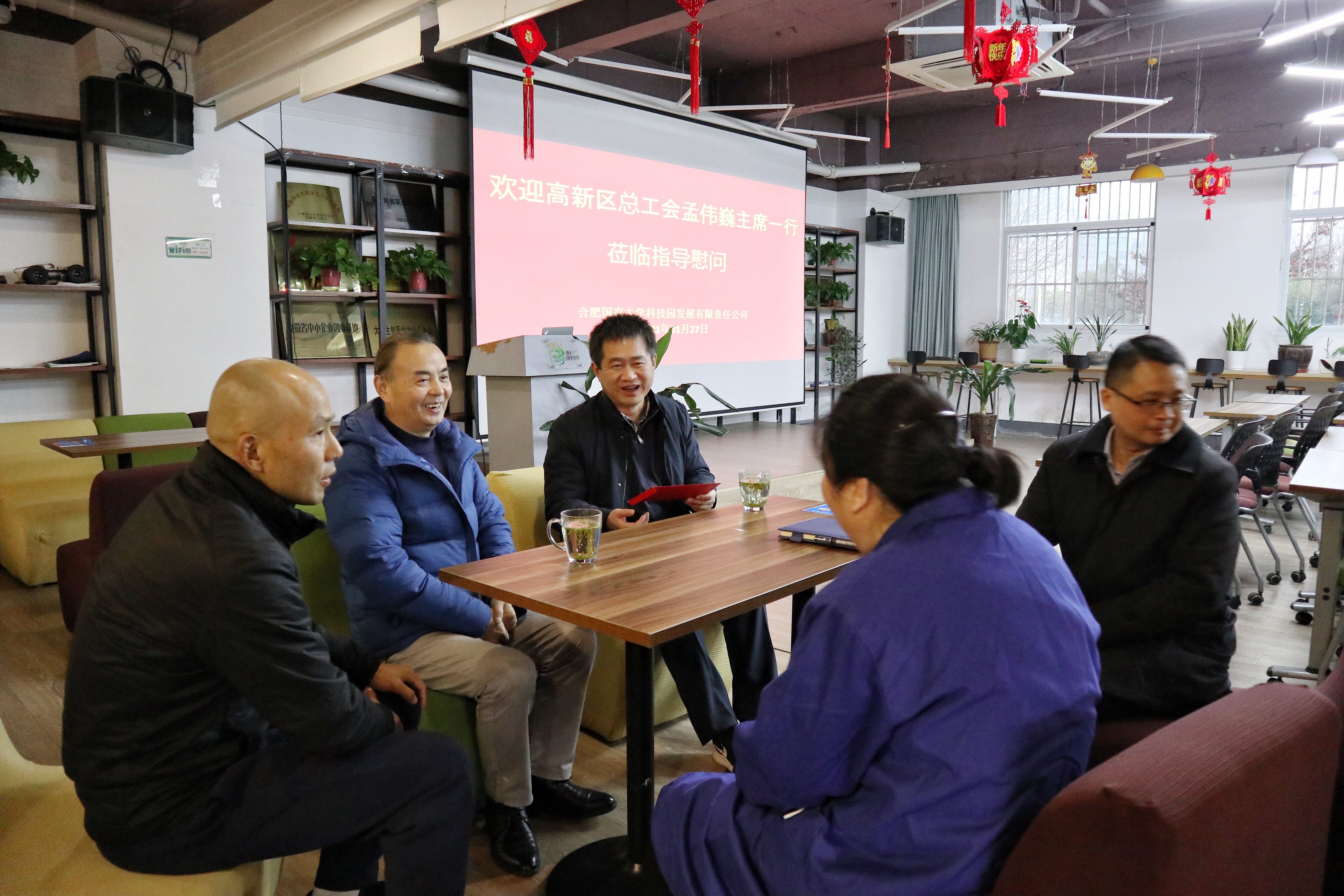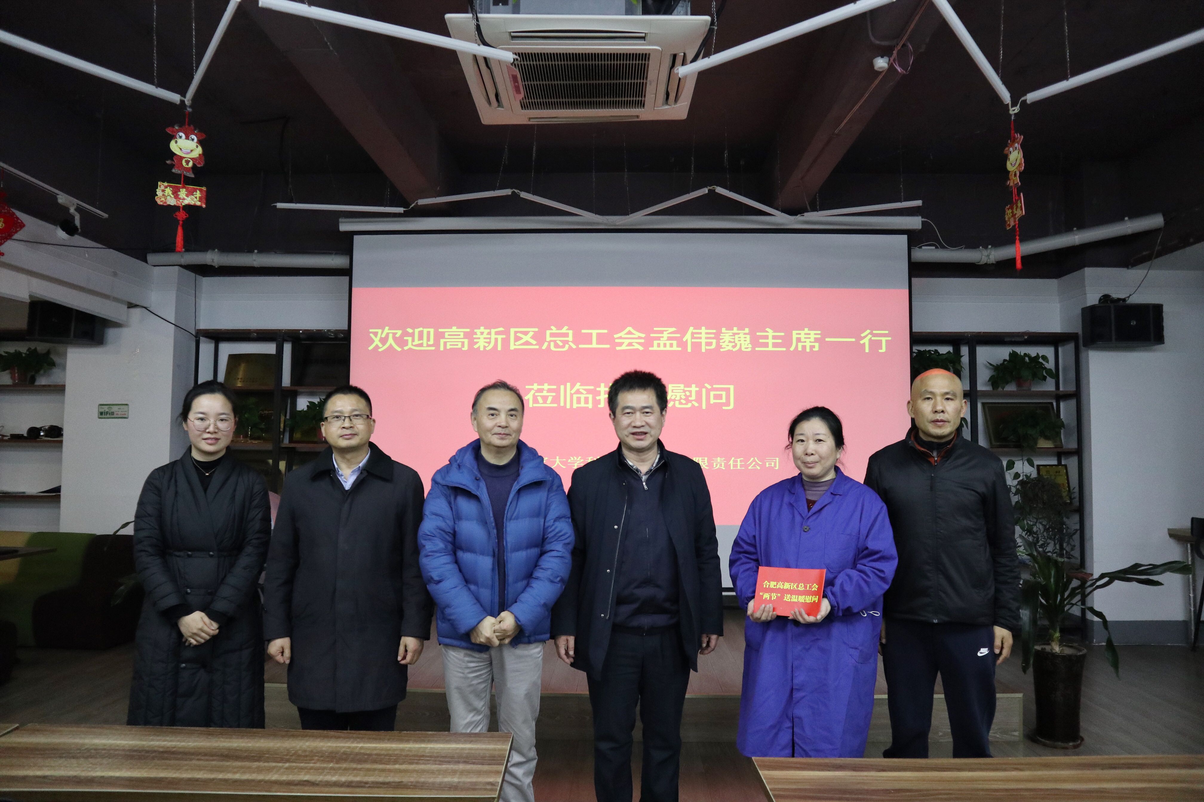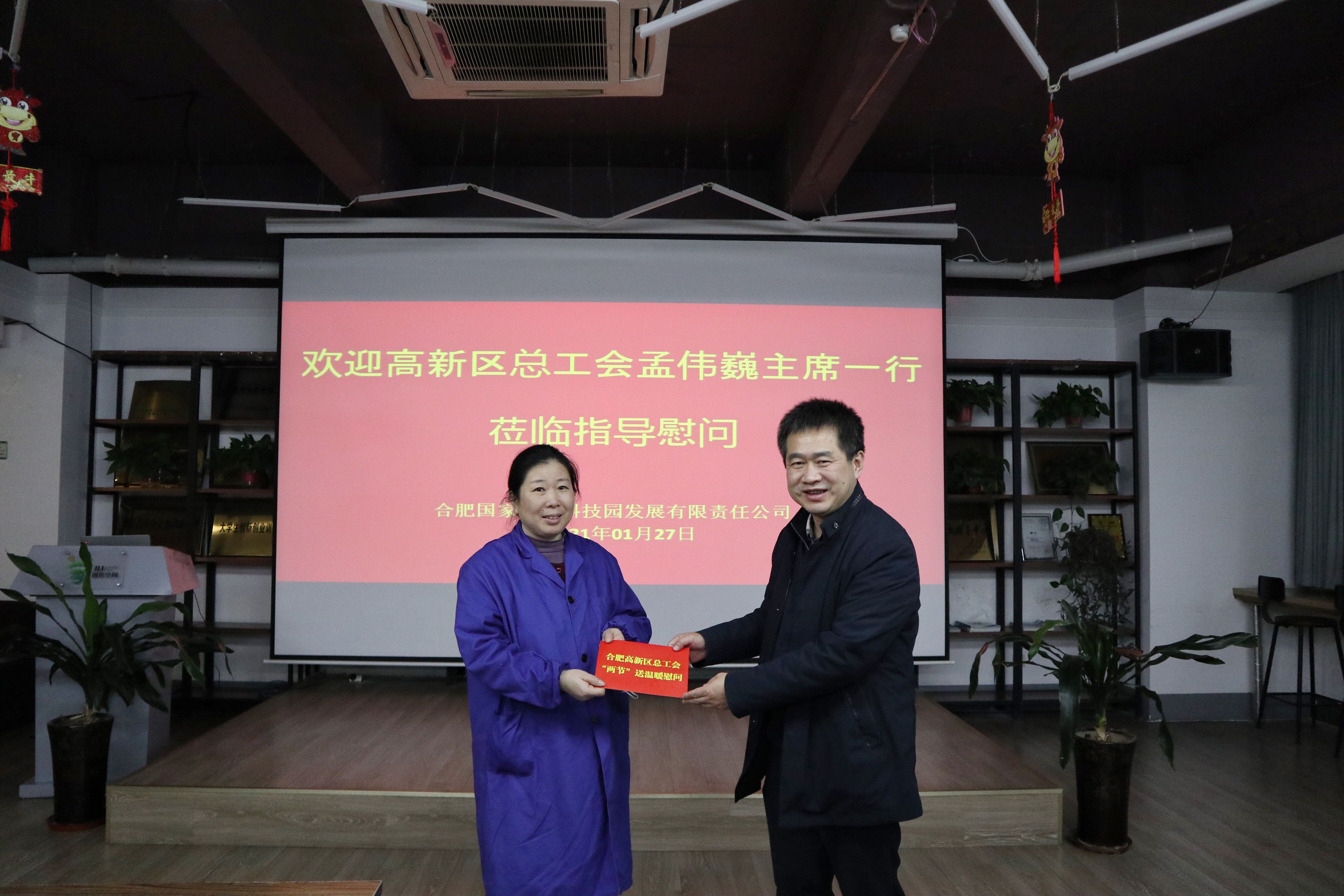 2021年1月27日下午,合肥高新区总工会主席孟伟巍、办公室主任曹学慧一行在304永利集团总经理王荣钊的陪同下,走访园区并慰问企业困难职工李莉丽。