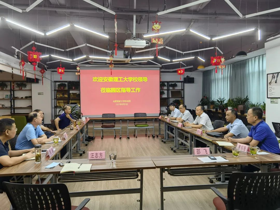 8月5日下午,安徽理工大学党委书记郭永存、科研部部长张平松、合肥高等研究院执行院长、院士办主任徐良骥、大学科技园筹建负责人黄绍服、校团委副书记程刚、党政办科长邵飞一行来园调研交流,大学科技园董事长韦一玉、总经理王荣钊、财务总监孟庆川、副总经理毛庆热情接待了来宾。