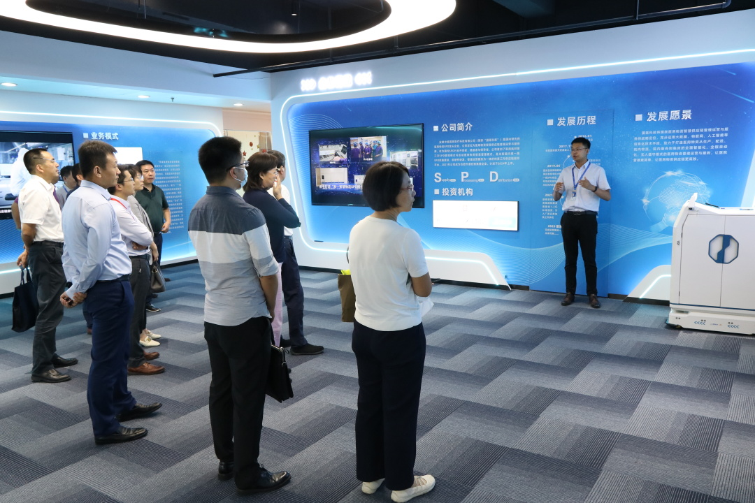 参会领导与火炬导师一行首先参观了公司展厅,国医科技企划部总监马信阳结合图文和视频进行现场解说,同时通过智能柜、AGV机器人等智能硬件操作演示展示了国医科技当前自动化、智能化产品应用场景。