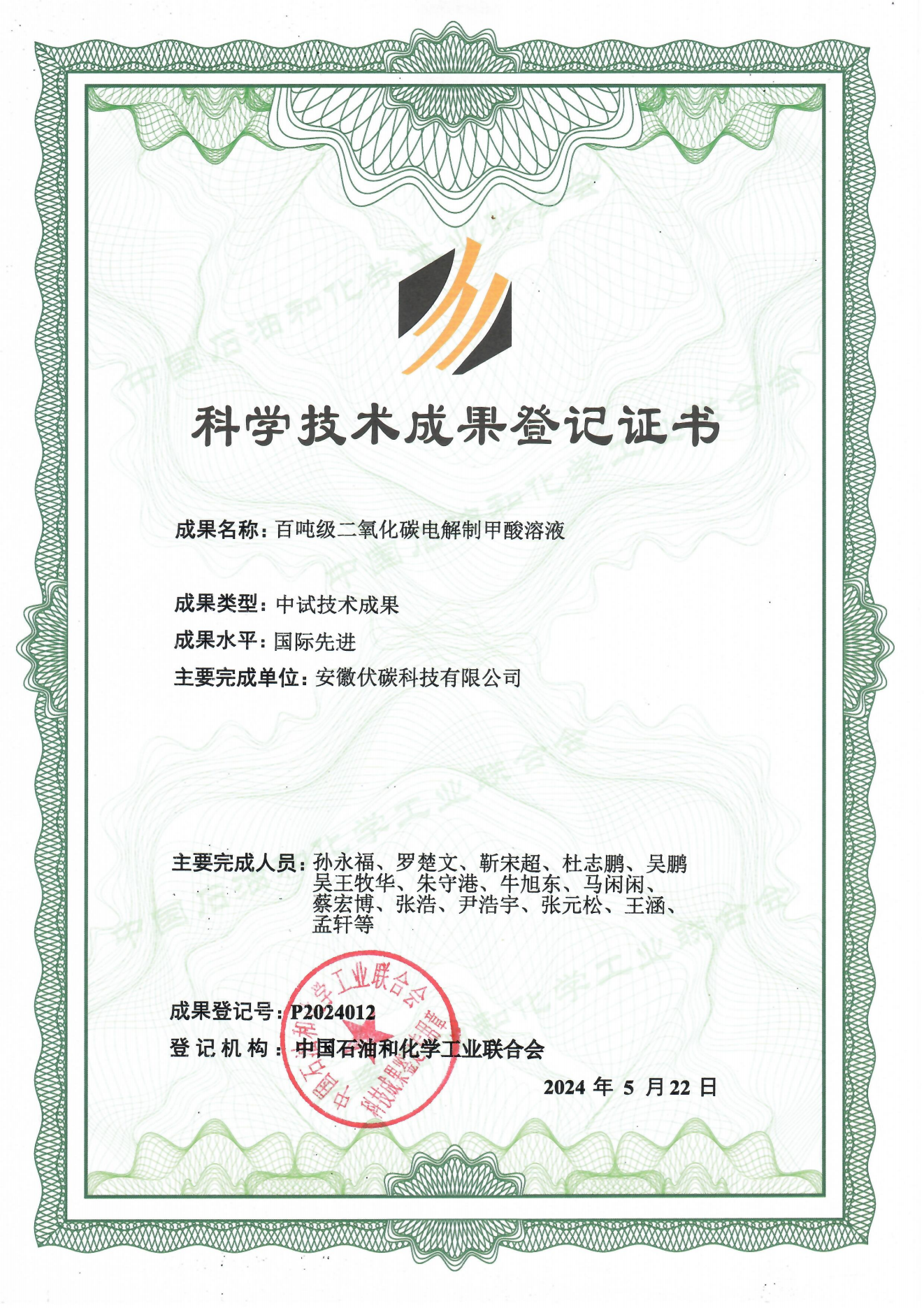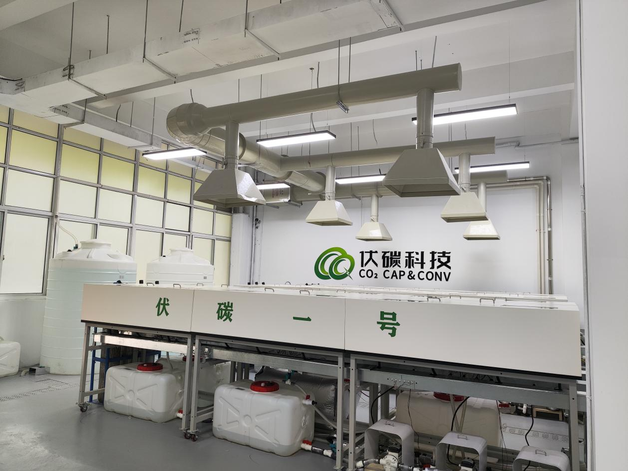 安徽伏碳科技有限公司成立于2021年10月,中科大赋权企业,是一家负碳技术的整体解决方案商和设备制造商,专注于二氧化碳电转化利用以及碳捕集、碳监测技术的研发与产业化。“百吨级二氧化碳电解制甲酸溶液”装备成果,利用自主研发的高性能电催化剂,通过绿电减碳技术,将温室气体二氧化碳转化为高附加值化学品——甲酸,甲酸可以广泛应用于农药、医药、橡胶、染料、皮革、化学、能源、金属加工、纺织印染以及作为工业溶剂等多个行业领域,变废为宝。该项成果推动了二氧化碳资源化利用的技术开发,实现碳循环利用和电能消纳的双重增益,突破了国际上对温和条件下二氧化碳资源化利用的技术难题。