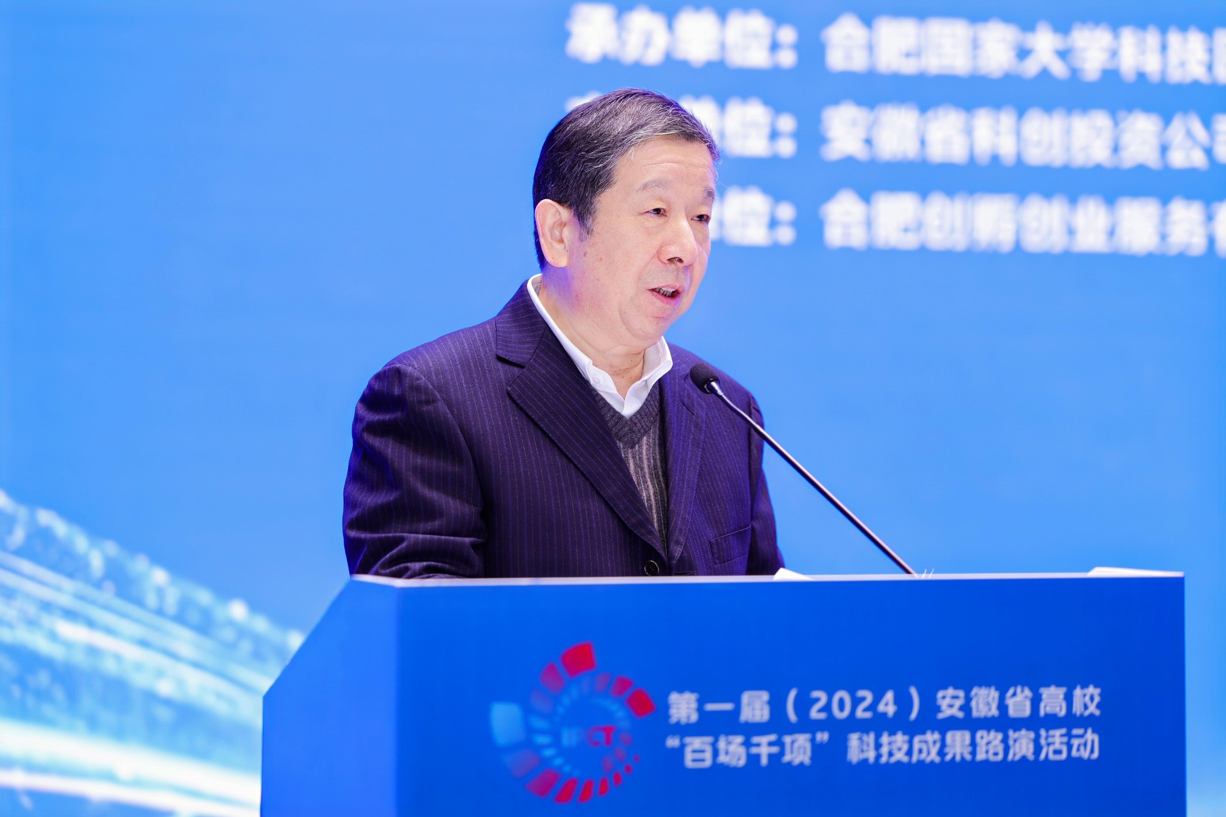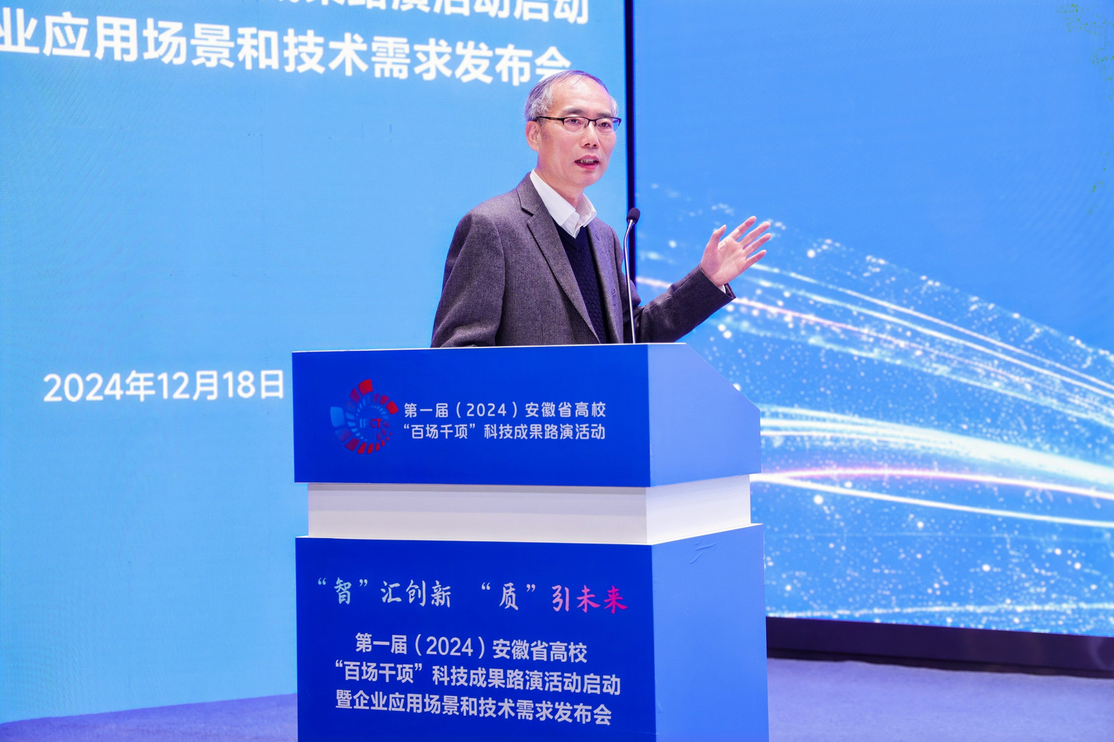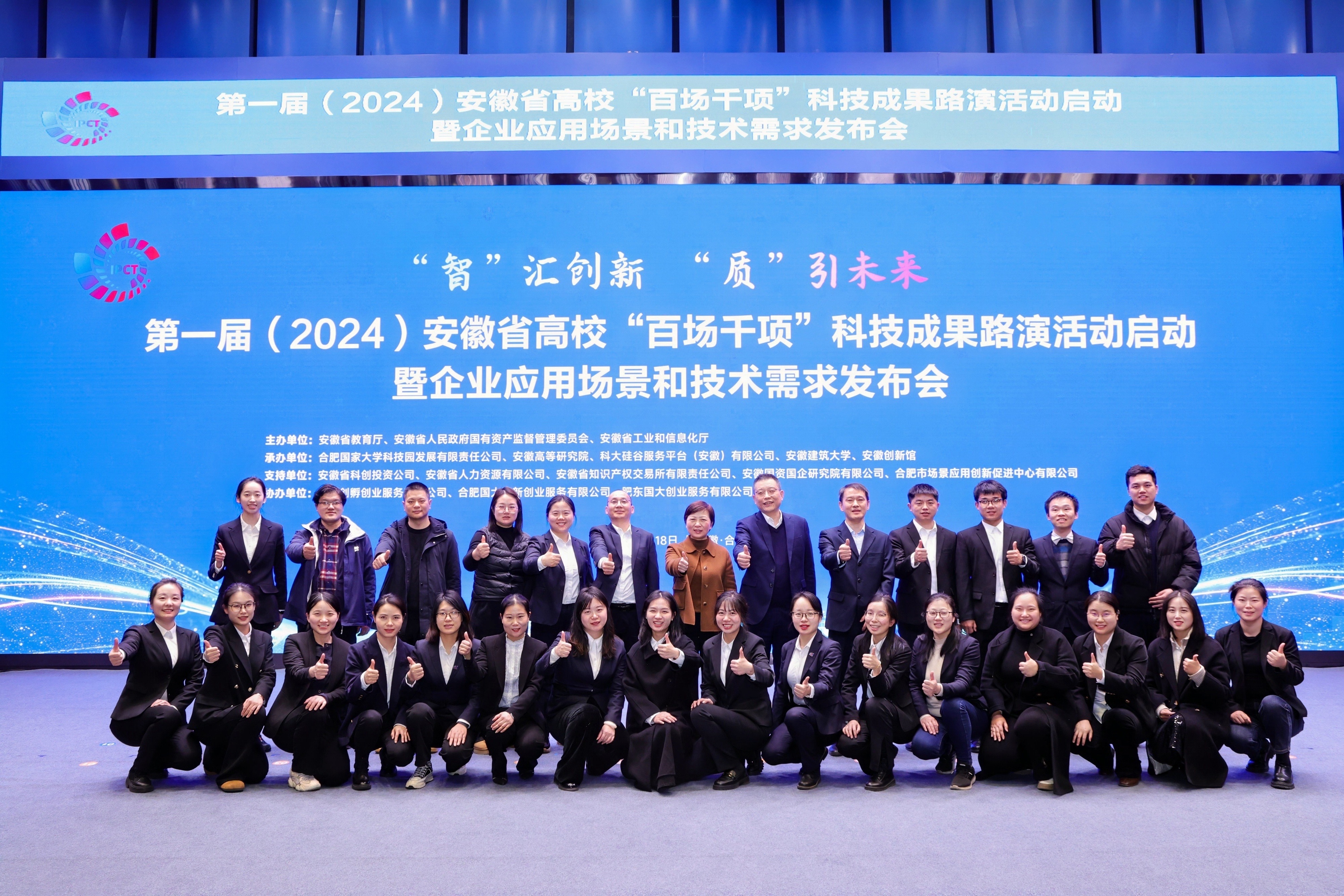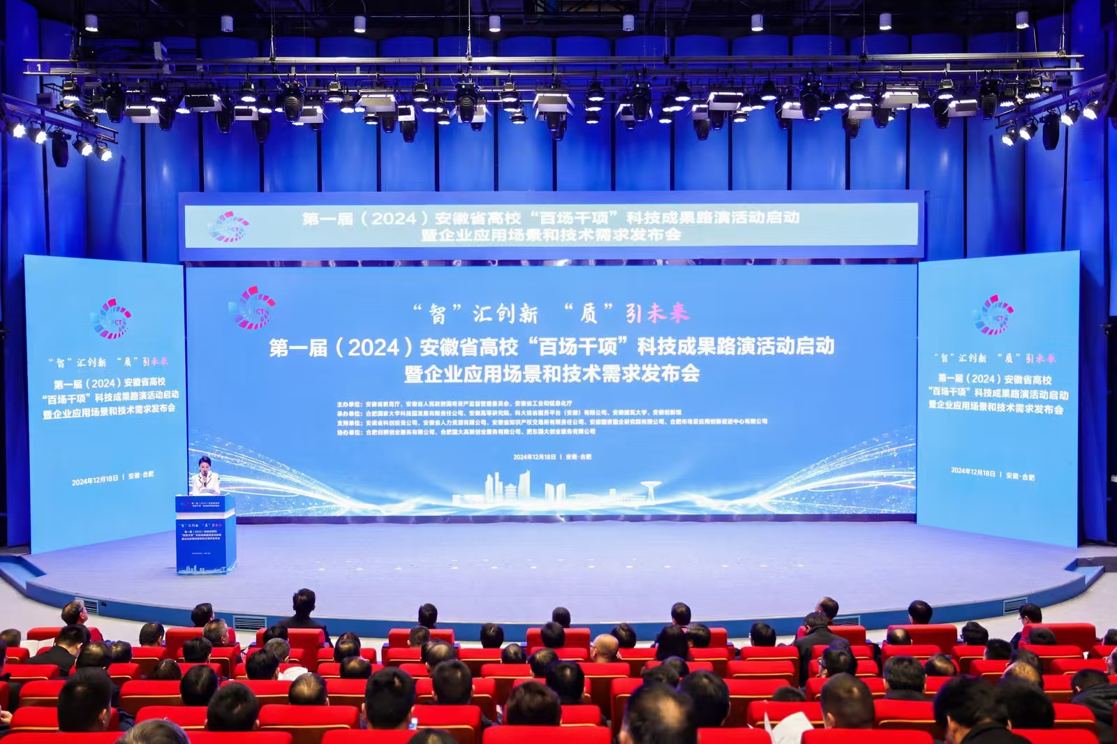 12月18日,以“‘智’汇创新 ‘质’引未来”为主题的第一届(2024)安徽省高校“百场千项”科技成果路演启动活动暨企业应用场景和技术需求发布会在合肥隆重举行。安徽省委教育工委委员、省教育厅副厅长储常连,安徽省国资委党委委员、总会计师吴明,安徽省工业和信息化厅副厅长罗文杉出席大会并致辞。安徽省科技厅党组成员、副厅长武海峰,安徽国控集团党委副书记、总经理虞建斌,集团党委委员、副总经理程红波出席大会。来自全国61所高校主要负责人和科研部门负责人,38家省属企业负责人和科研部门负责人齐聚一堂,94个高校科研团队、多家投资机构和技术经理人参加对接活动。